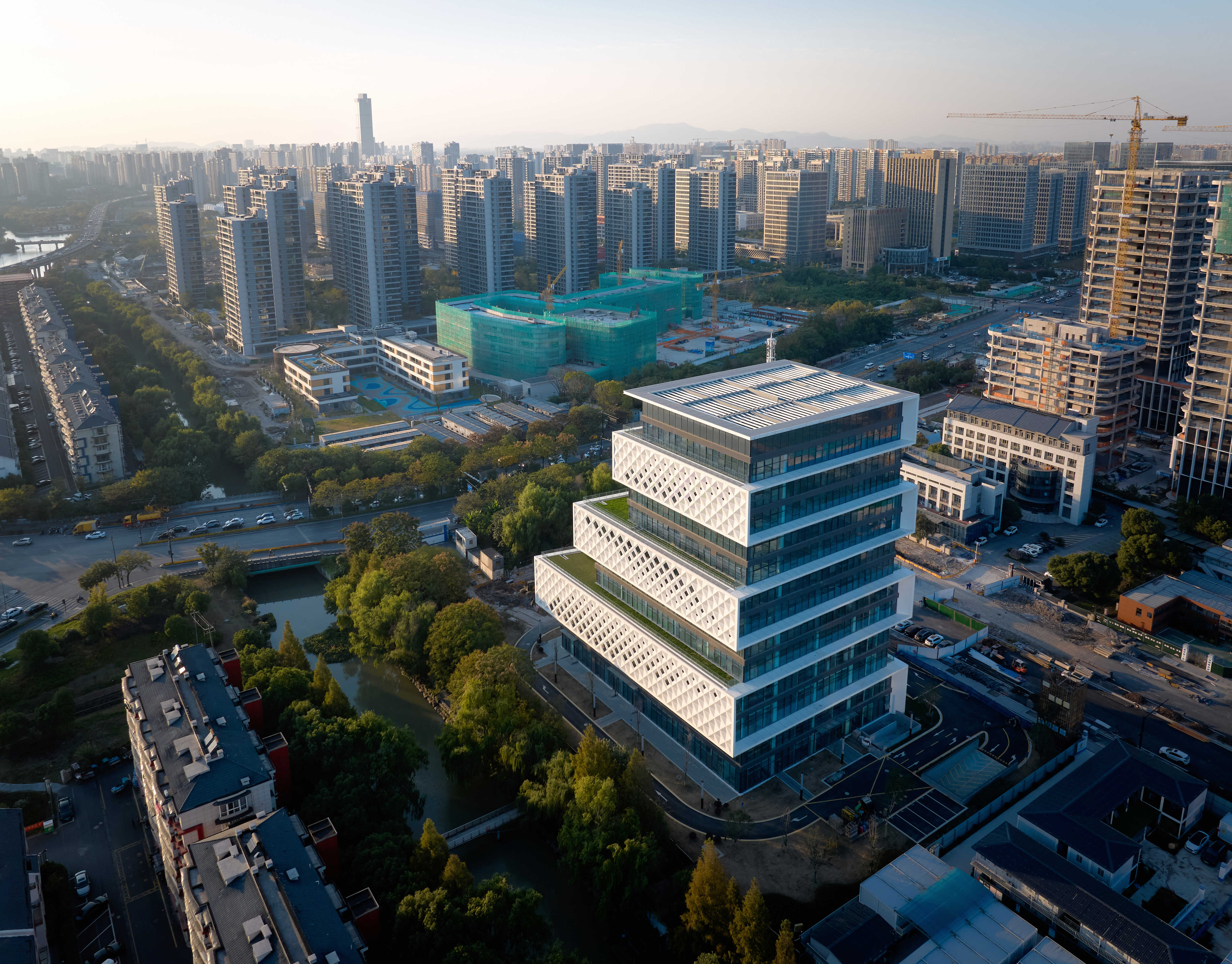 項(xiàng)目以“折疊森林”為設(shè)計(jì)理念,以”折疊生長"的形態(tài)實(shí)現(xiàn)建筑與自然的有機(jī)融合。建筑每兩層為一個(gè)單位,仿佛由一張紙張折疊成塊,從地面生長至天空,形成建筑的基本形體。建筑折疊的實(shí)體部分采用白色穿孔鋁板其余部分采用灰色玻璃或鋁板,通過強(qiáng)烈的虛實(shí)對比,形成有張有弛的建筑造型效果。未來感科技感的獨(dú)特造型,呼應(yīng)場所精神形成立體空中花園;兼具功能與美感的雙層表皮細(xì)節(jié)構(gòu)造,既滿足功能需求,又帶來豐富的光影效果;內(nèi)外統(tǒng)一的四層通高共享中庭,與退臺花園滲透融合;光伏玻璃、空中花園、被動遮陽等材料技術(shù)的運(yùn)用,降低建筑能耗、打造了高品質(zhì)的綠色建筑。